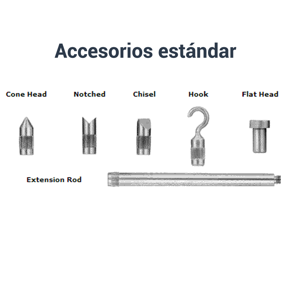 Adaptador/cargador de CA, estuche de transporte, gancho, cincel, cabeza plana, cabeza ranurada, colgador, cabeza cónica, adaptador roscado, varilla de extensión, cable USB